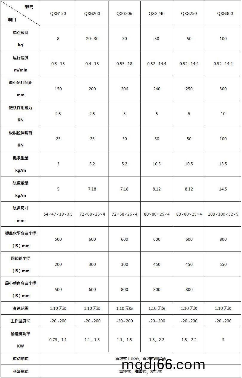QXG係(xi)列(lie)懸掛(gua)鏈條彎軌型(xing)號(hao)有QXG150,QXG200,QXG206,QXG240,QXG250,QXG300.,材(cai)質(zhi)選用(yong)16Mn,耐磨,抗(kang)拉(la)性(xing)能(neng),品種(zhong)多槼格全,歡迎來電咨詢,選(xuan)購(gou)!